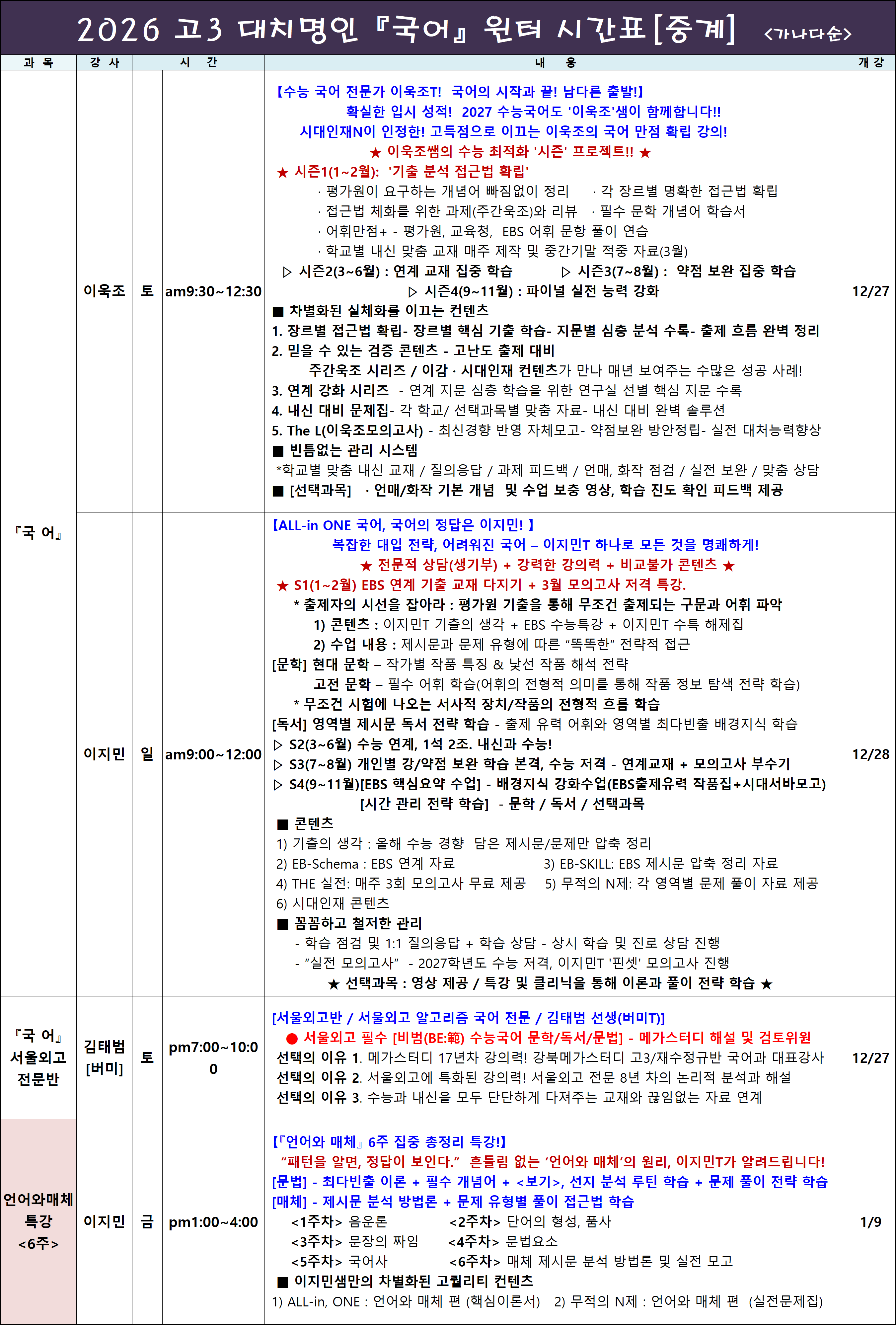 ♣ 2026 고3(현고2) 겨울방학 시간표 ♣